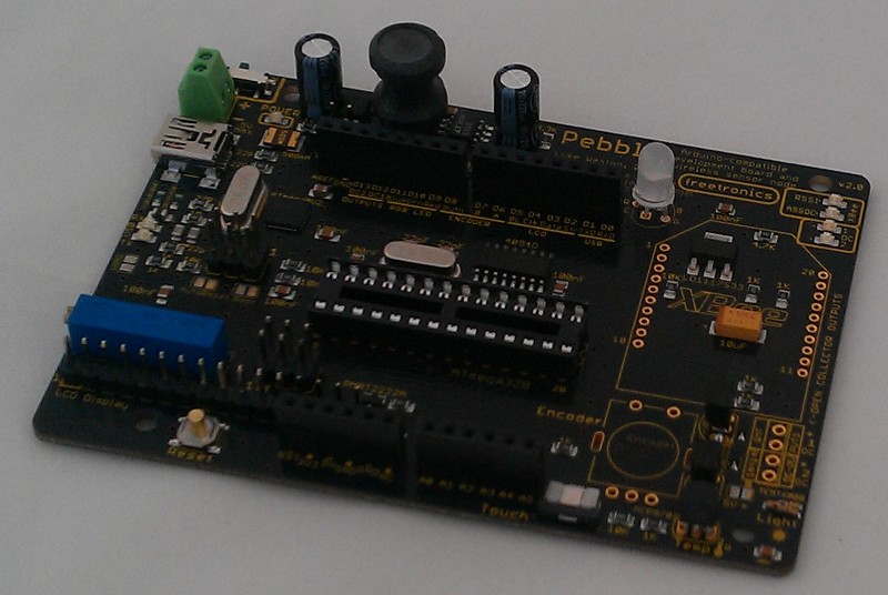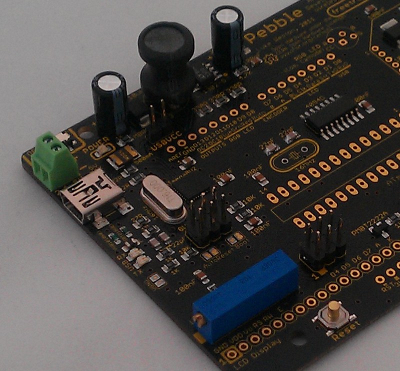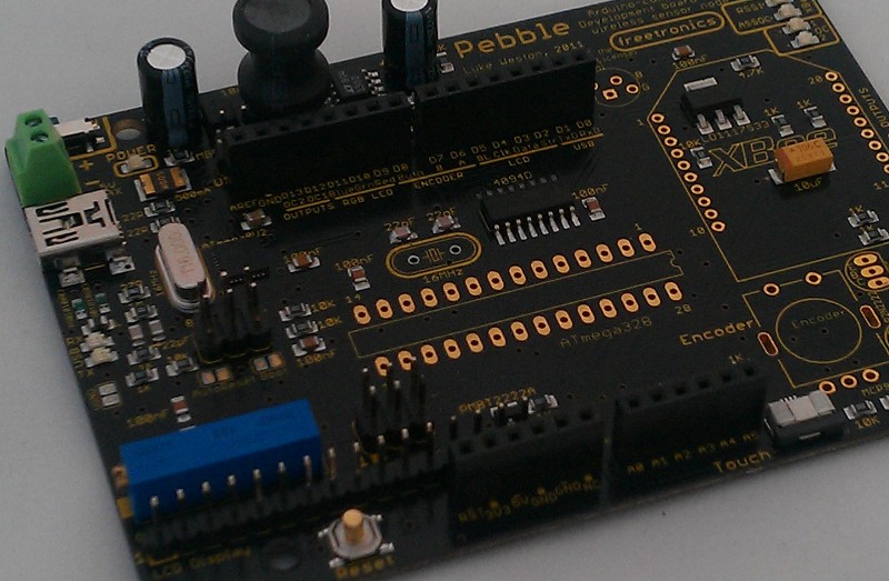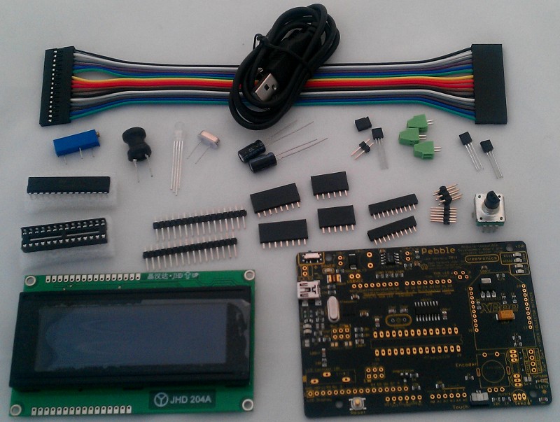 Here's a basic guide to assembling a Pebble (Mk. 2) kit. In your kit, all the SMD components are pre-soldered on the board, the ATmega8U2 USB-to-serial circuit on the board has been pre-tested and the ATmega8U2 flashed appropriately, and the ATmega328 microcontroller has been pre-flashed with an appropriate Arduino Uno compatible bootloader.
