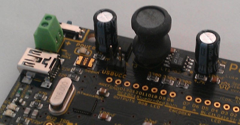 Note: The RGB LED must be inserted the correct way, with the flat side of the LED corresponding to the silkscreen marking. One of the LED pins is longer than the others, and one of the holes in the PCB has a square pad. The long lead goes into the square pad.