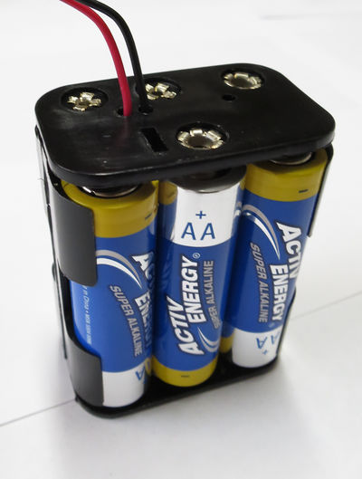 The standard power source for the SimpleBot is 6x AA alkaline cells for a nominal 9V battery pack. In testing a SimpleBot has run actively (driving motors in a sequence) for over 4 hours before batteries were depleted, with wifi enabled.