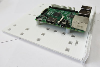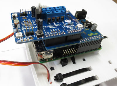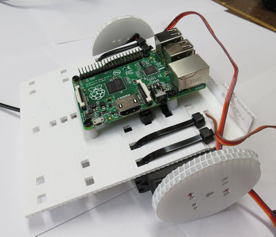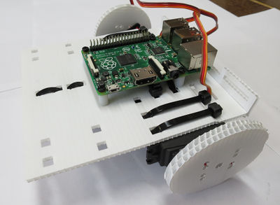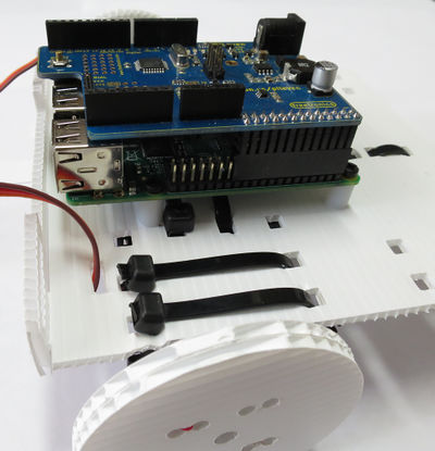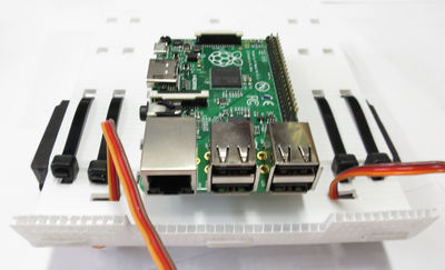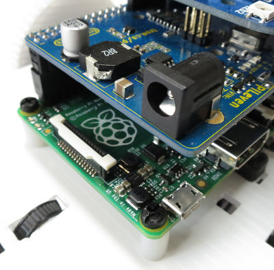 After clipping on the bumper, we screw the Raspberry Pi onto the base plate on top of 10mm high standoffs.