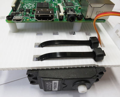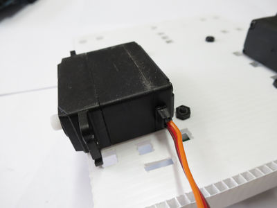 Each servo is held on via two cable ties. Each cable tie runs through the mounting holes, around the servo.