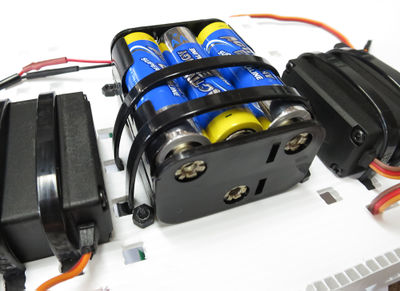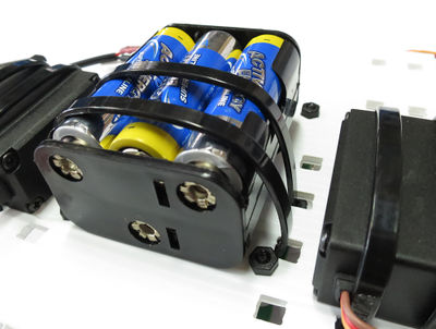 The 6 cell battery pack is also mounted using two cable ties to form a "cradle" under the robot base. Unlike the servos, you want the battery "cradle" to be a bit loose so you can pull the pack out to change batteries.