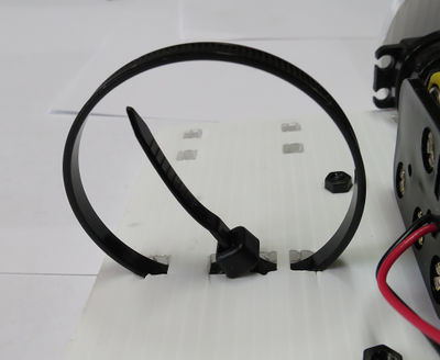 Flip the robot over, and adjust the cable tie until the robot seems to sit flat on the "sled". Then cut off the end of the tie: