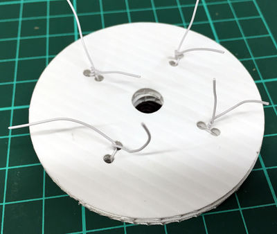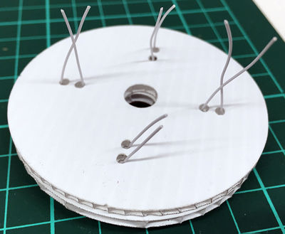 The SimpleBot has two wheel assemblies, and each assembly is made up of a sandwich of two pieces of Corflute, a cross-shaped servo horn, and short pieces of wire. We're using thin "wire wrap" wire.