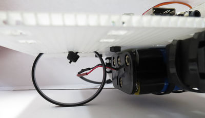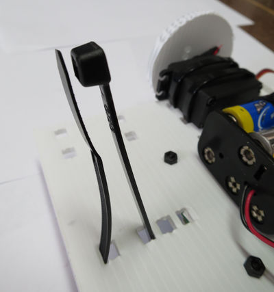To keep costs low, the SimpleBot uses a simple cable tie to form this "sled" to balance against. Forming the "sled" is a little tricky to explain, you may want to go and look at a completed SimpleBot in order to understand.