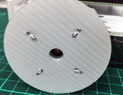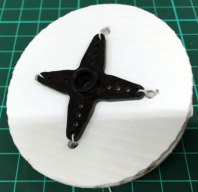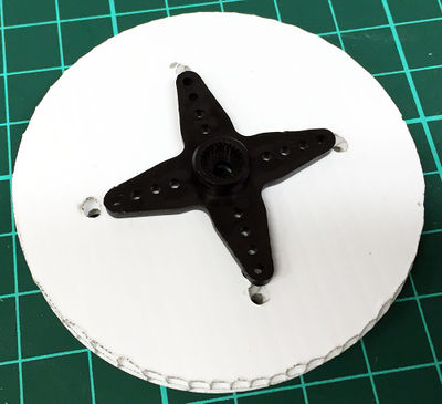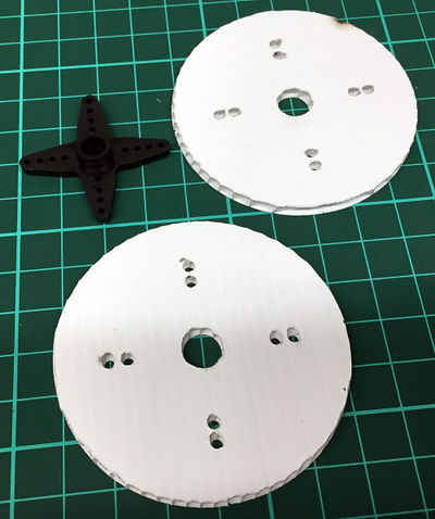 Place two of the Corflute wheel pieces together, aligned so that the ribs on the wheels are at right angles to each other for maximum strength. Sit the servo horn on top, with the thick mounting lug facing up: