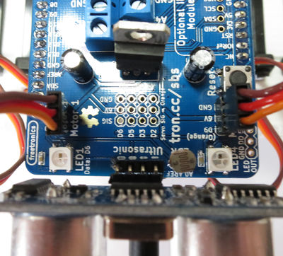 Connect the servo motors by feeding the connectors through the small holes in the base plate, then plug them into the two "motor" headers. Orientation of the servo connections matter - the yellow signal wire faces towards the front of the bot, as shown.