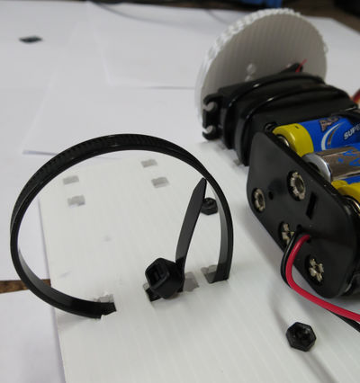 From the top side of the SimpleBot, the battery cradle cable ties will look like this: