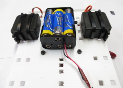 With the SimpleBot base upside down, place the battery pack between the two servos. The lead should come out towards the rear of the robot, pointing away from the front bumper.